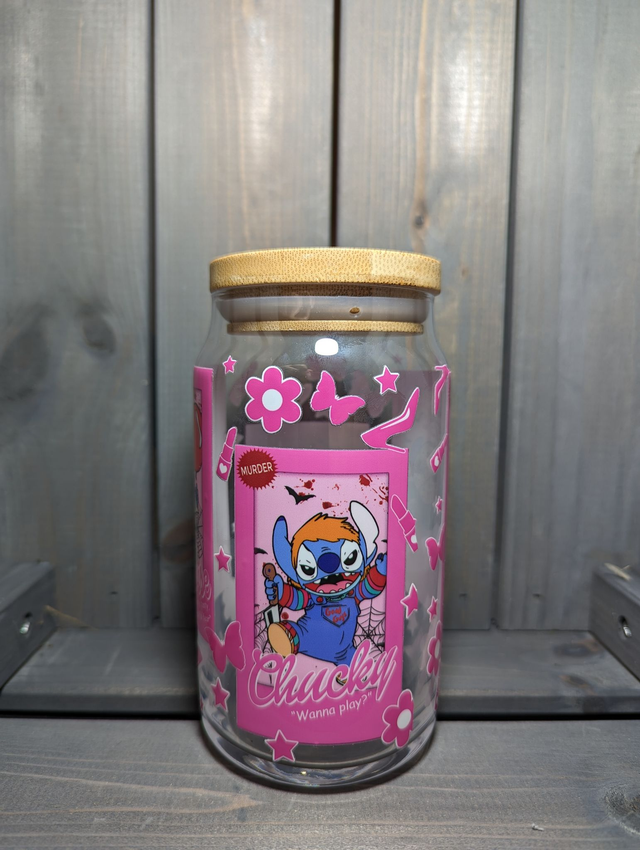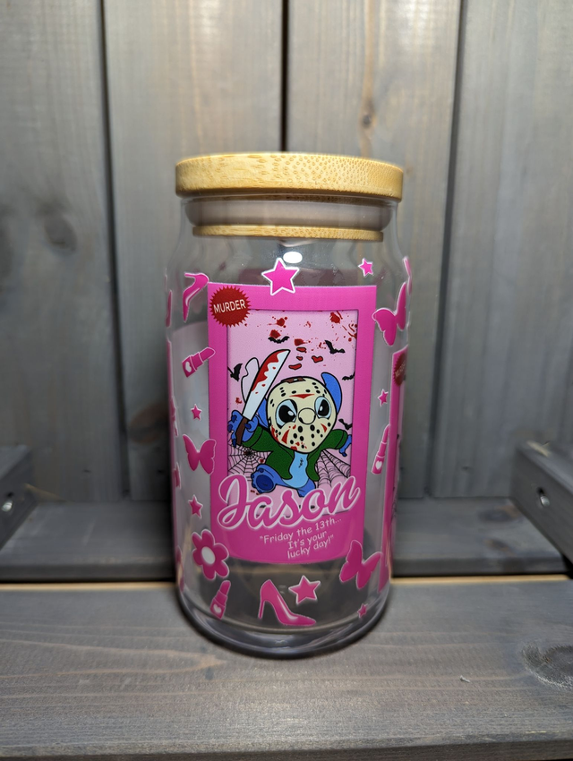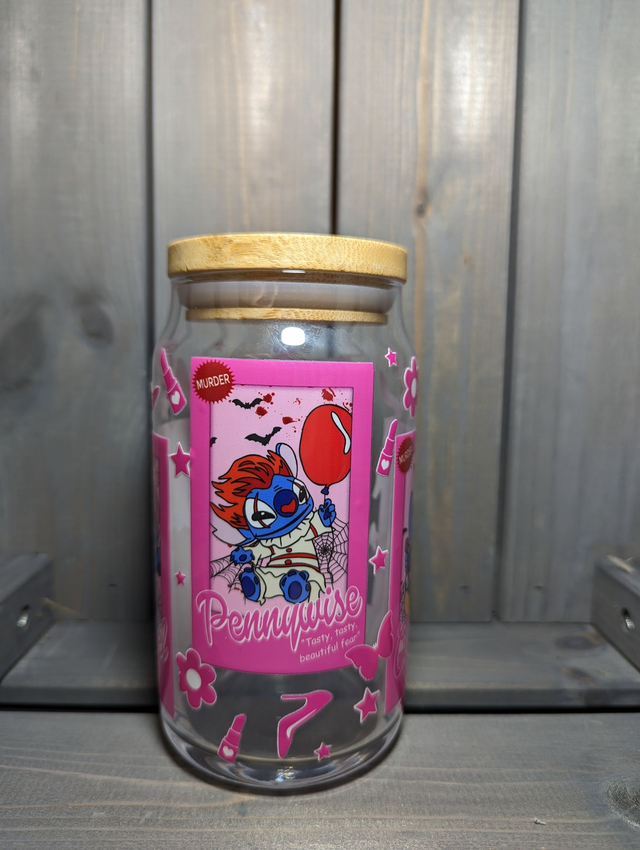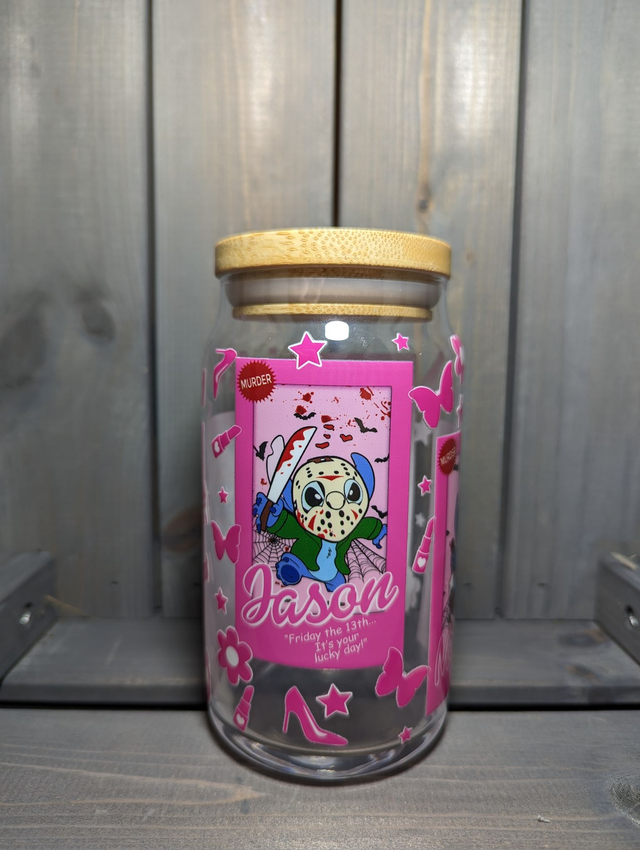 Custom Made Halloween Stitch Jar, comes complete with a wooden lid and a glass straw.